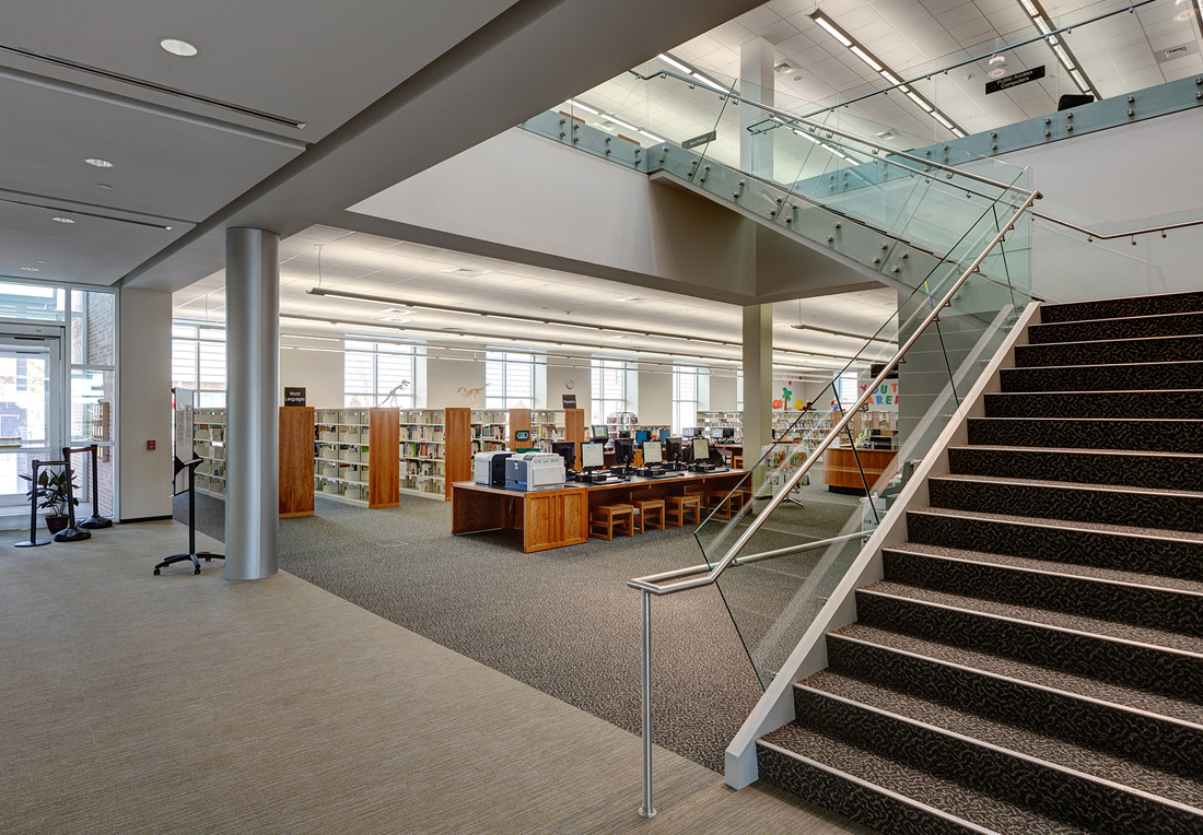 This two-story, 40,000 SF public library is constructed from insulated metal panels with metal-stud backup, curtain wall and storefront glazing. Materials also include brick and cast stone. The main building features a TPO roof with a steel-framed canopy and standing-seam metal roof. Site related improvements include 75,000 SF of concrete paving. This project was named a 2012 HBJ Landmark Award Nominee.