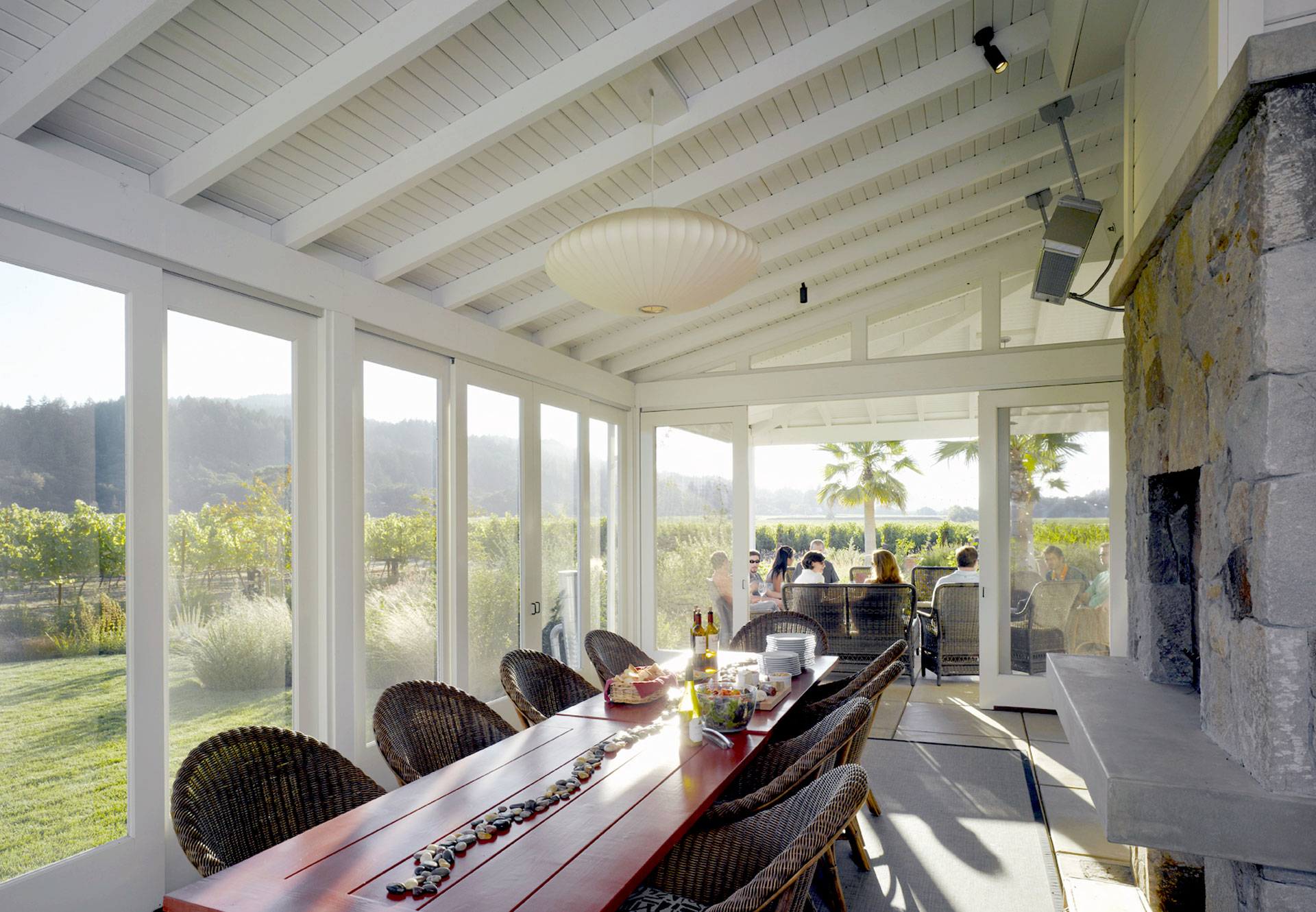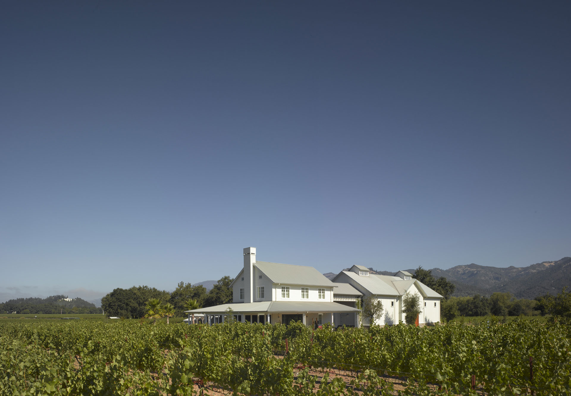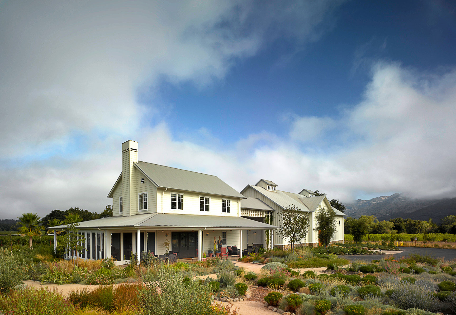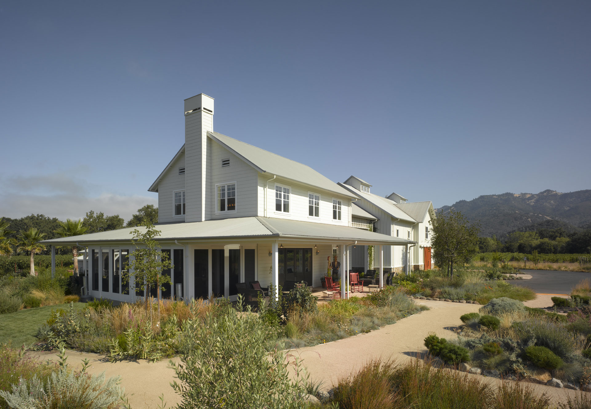 Covered walkways and indoor/outdoor entertainment spaces surrounded by drought resistant landscaping provide visitors with a truly authentic Napa Valley winery experience.